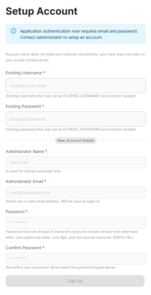 For existing users who have been using Username & Password (Deprecated), you need to set up a new admin account. To prevent unauthorized ownership claims, you must first authenticate using the existing username and password configured as FLOWISE_USERNAME and FLOWISE_PASSWORD.