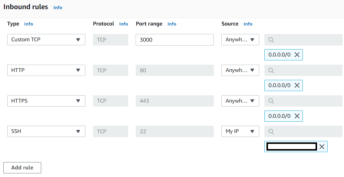 - Fill in your preferred security group name and description. Next, add the following to Inbound Rules and Create security group