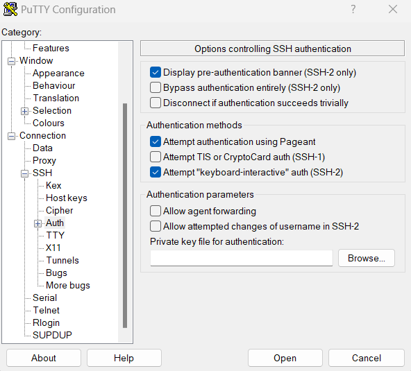 - From the left hand side bar of PuTTY Configuration, expand SSH and click on Auth. Click Browse and select the