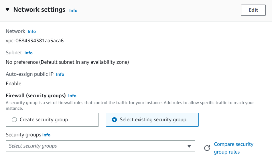 - Back to the first tab (EC2 Launch an instance) and scroll down to Network settings. Select the security group you’ve just created