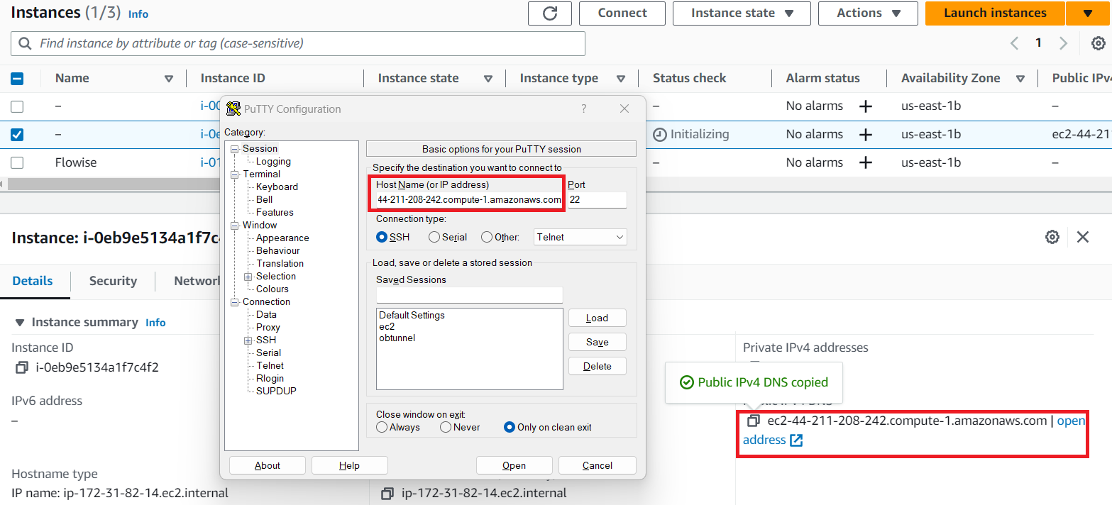 - Open PuTTY and fill in the HostName with your instance’s Public IPv4 DNS name