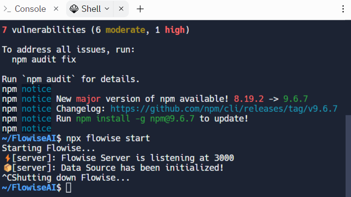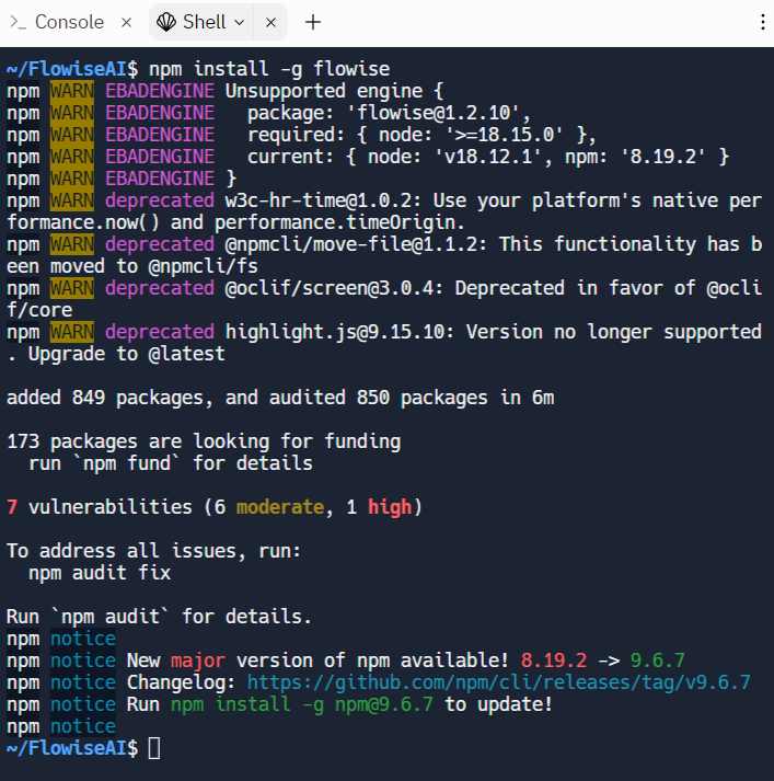 npm install -g flowiseinto the Shell terminal window. If you are having error about incompatible node version, use the following commandyarn global add flowise --ignore-engines