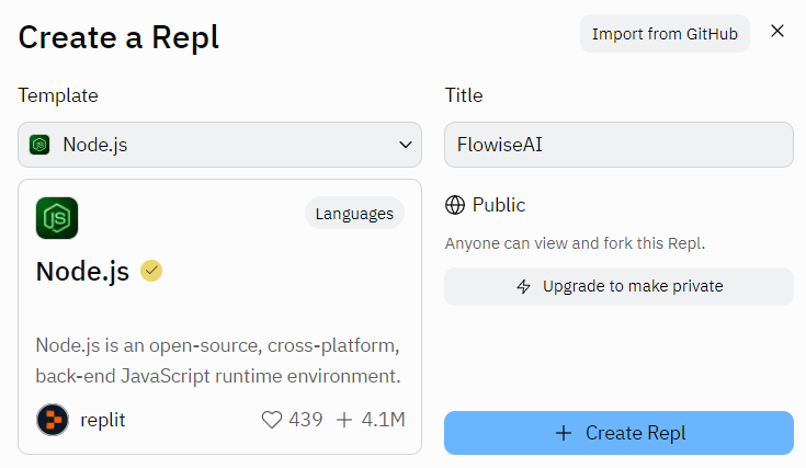 - Create a new Repl. Select Node.js as Template and fill in your preferred Title.