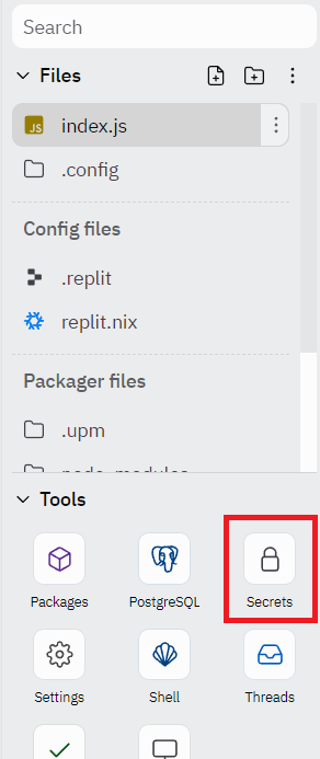 - After a new Repl is created, on the left hand side bar, click Secret: