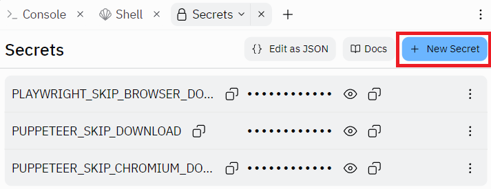 - Create 3 Secrets to skip Chromium download for Puppeteer and Playwright libraries.