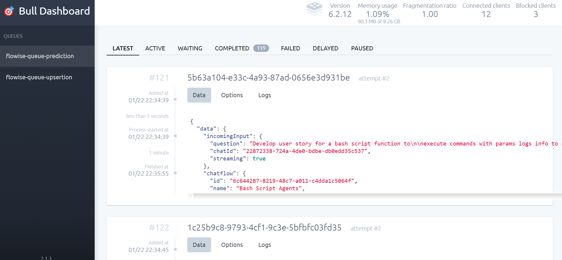 Set ENABLE_BULLMQ_DASHBOARD to true will allow users to view all the jobs, status, result, data by navigating to <your-flowise-url.com>/admin/queues