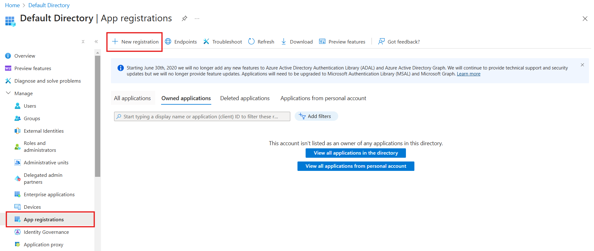 - From the left hand bar, click App Registrations, then New Registration: