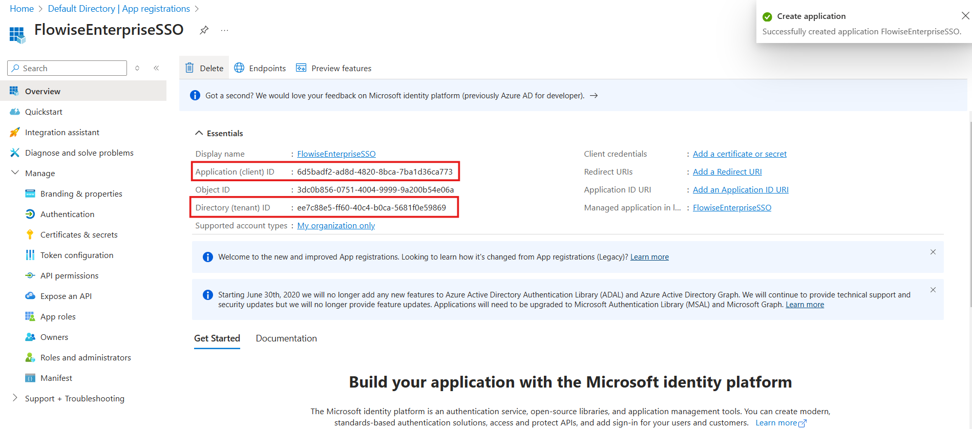 - After an app is created, note down the Application (client) ID and Directory (tenant) ID: