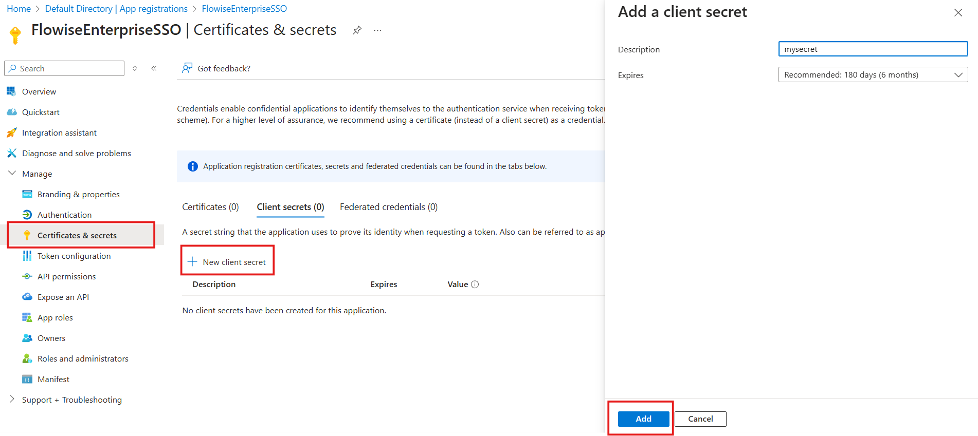 - On the left side bar, click Certificates & secrets -> New client secret -> Add: