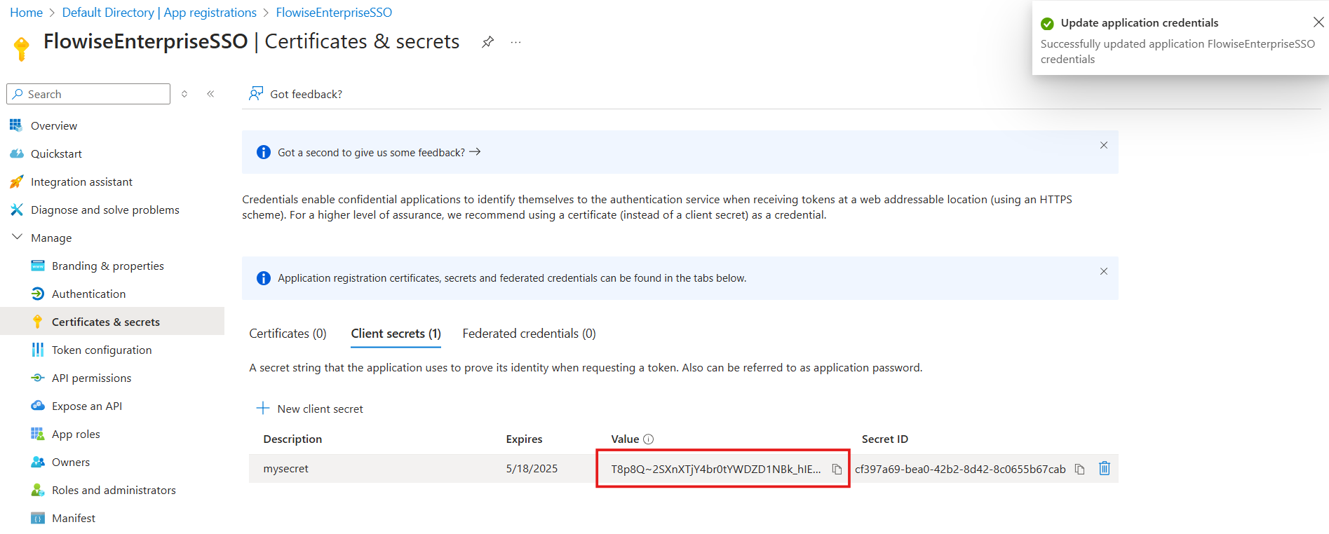 - After the secret has been created, copy the Value, not the Secret ID: