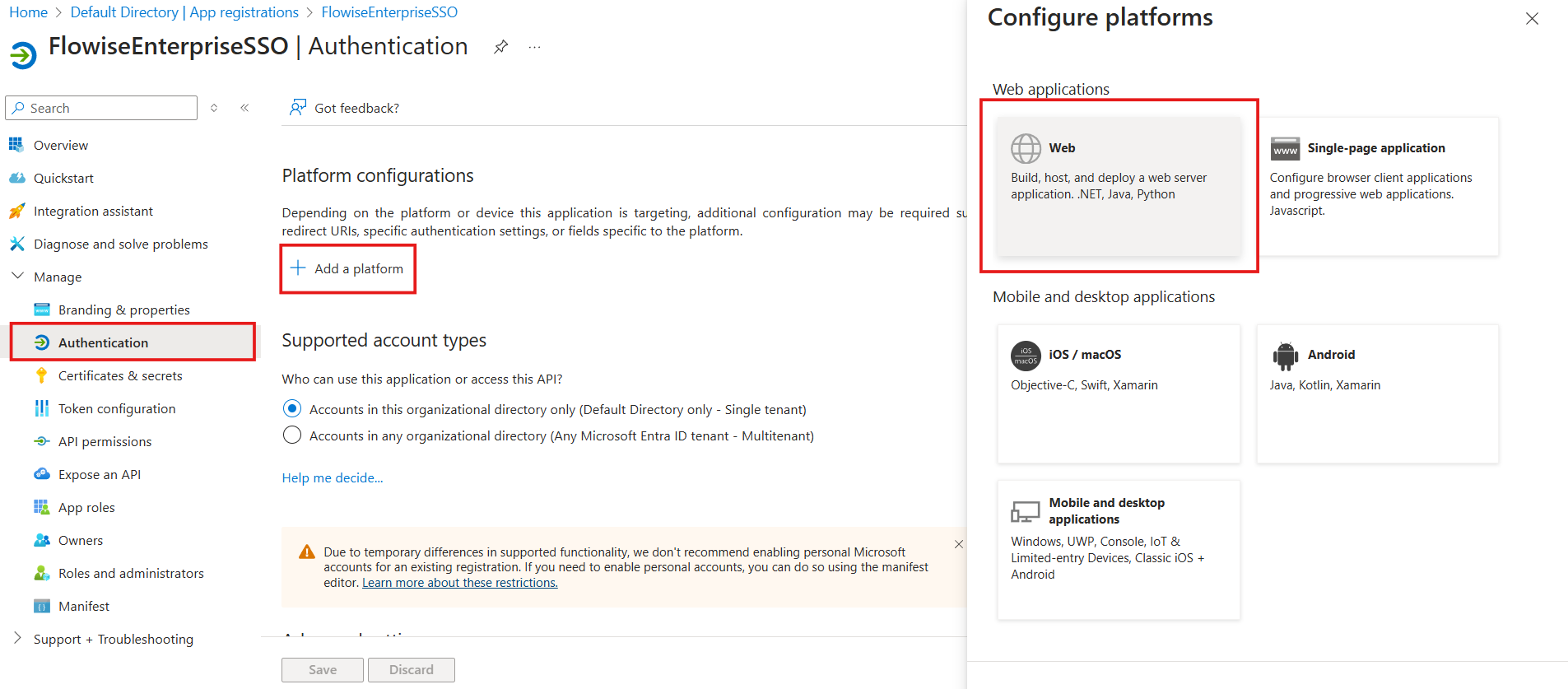 - Enter an app name, and select Single Tenant: