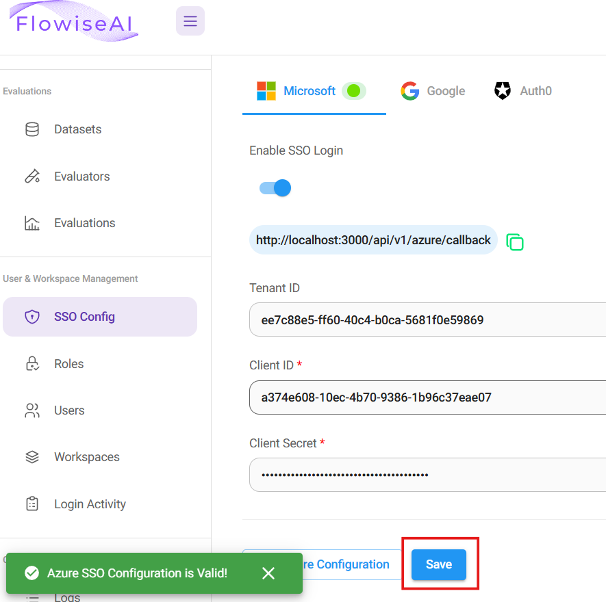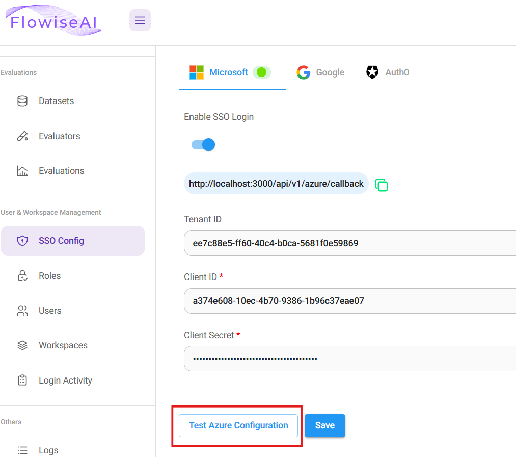 - Back to Flowise app, login as Organization Admin. Navigate to SSO Config from left side bar. Fill in the Azure Tenant ID and Client ID from Step 4, and Client Secret from Step 6. Click Test Configuration to see if the connection can be established successfully: