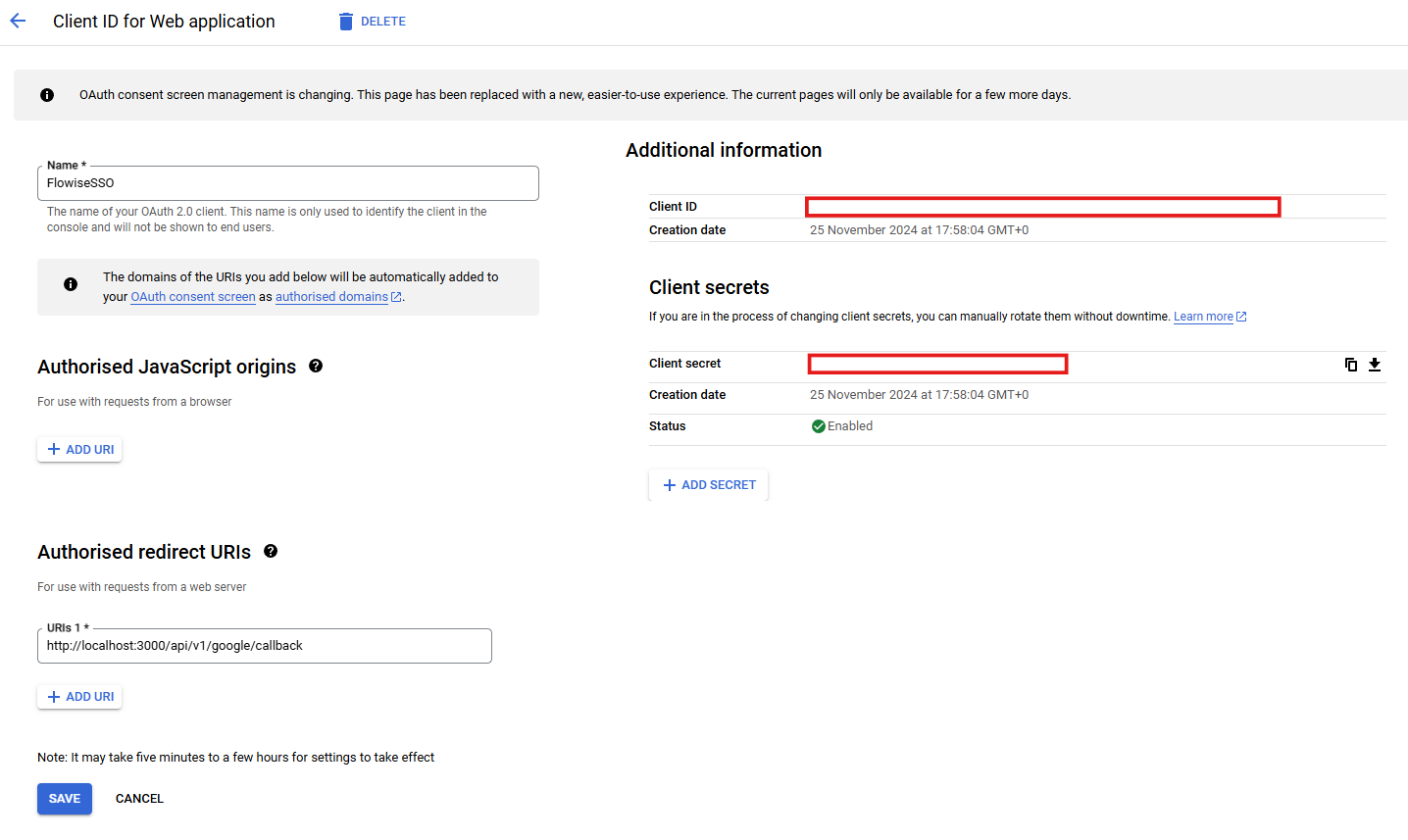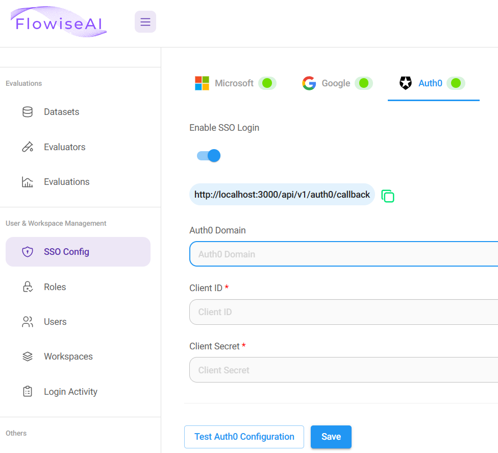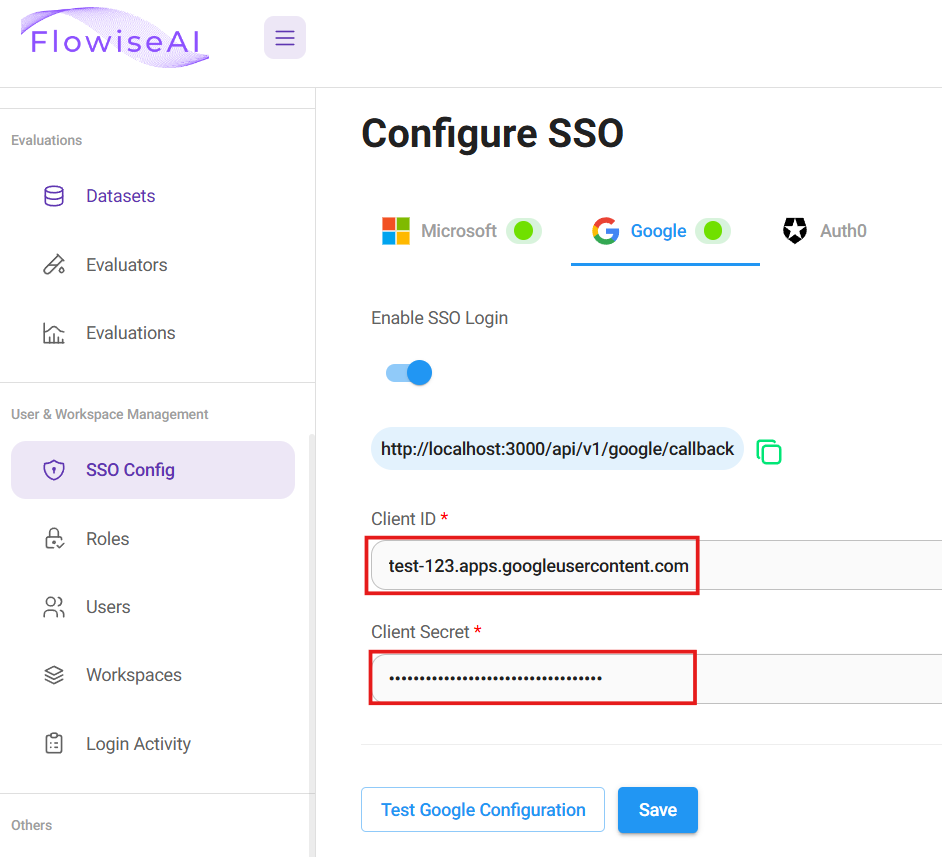 6. Back to Flowise App, fill in the Domain, Client ID and Secret. Test and Save the configuration.