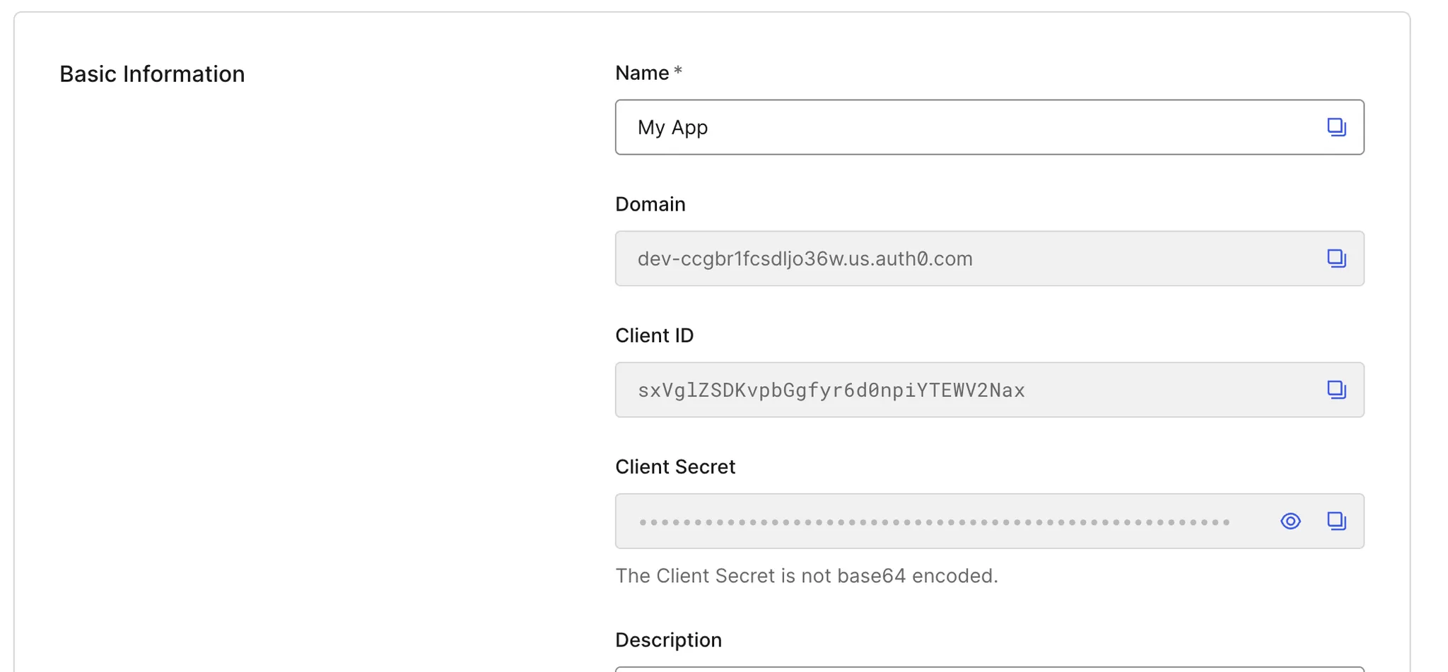 - Configure the fields such as Name, Description. Take notes of the Domain, Client ID, and Client Secret.