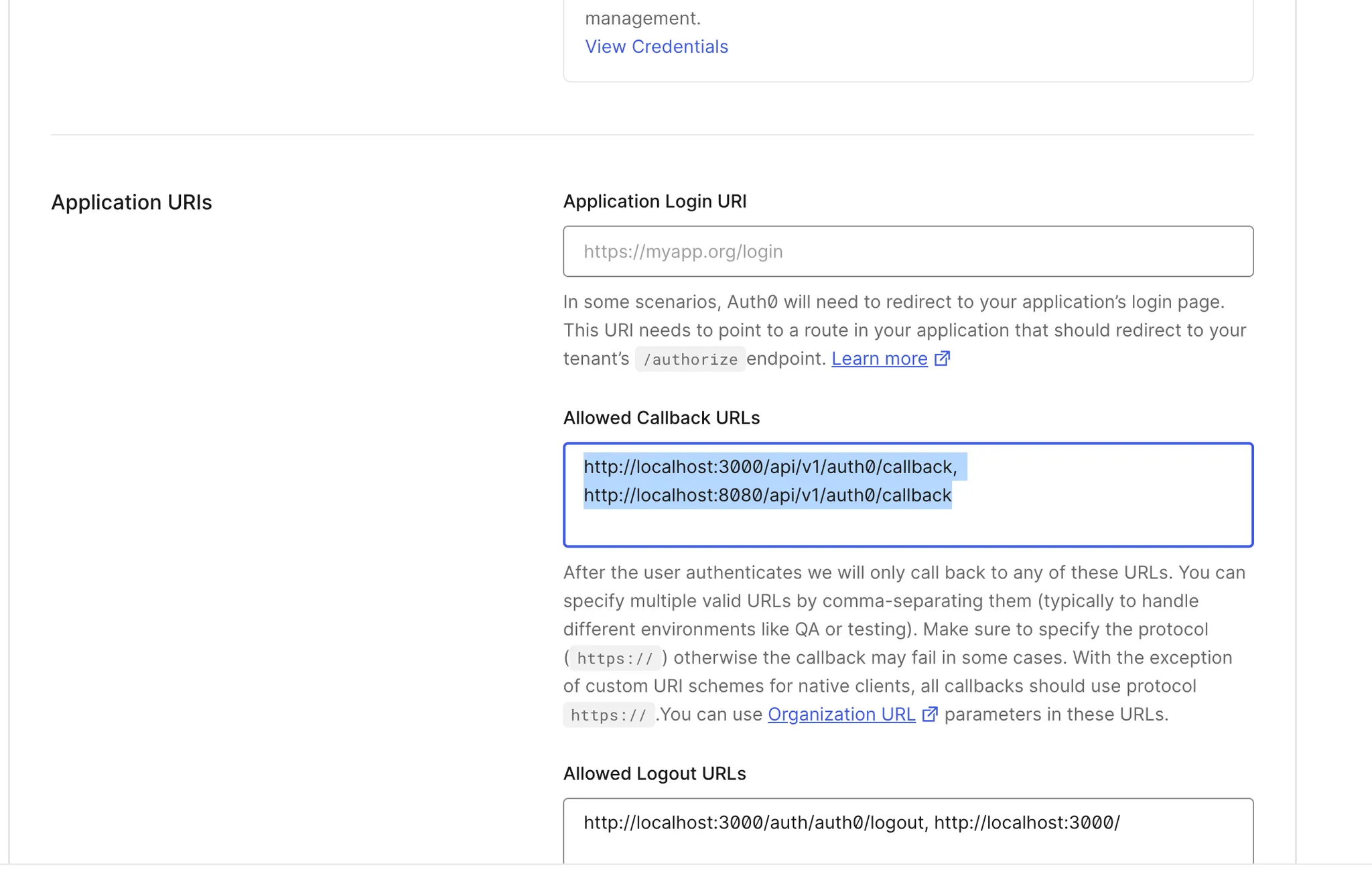 4. Fill in the Application URIs. This will need to be changed depending on how you are hosting it: http[s]://[your-flowise-instance.com]/api/v1/auth0/callback: