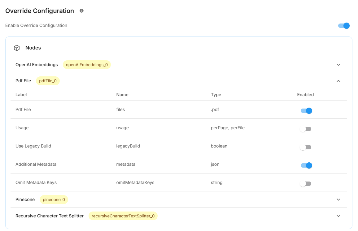 return f"Error in Flowise pipe: {e}"- After Function has been saved, enable it, and click the settings button to put in your Flowise URL and Flowise API Key: