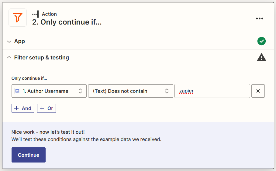 Configure Filter to not continue if received message from Zapier Bot then click Continue