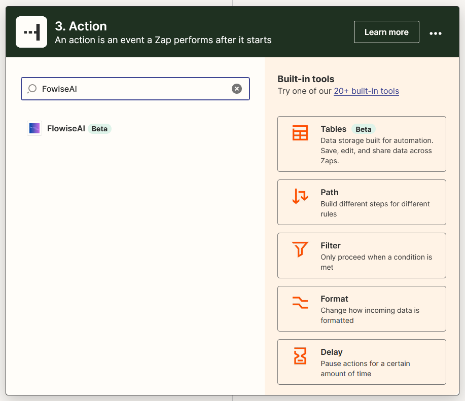 Click +, click or search for FlowiseAI