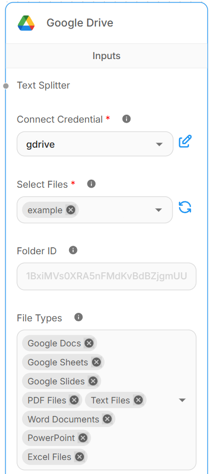 - Select Files or Folder ID: Choose specific files or provide a folder ID