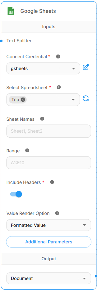 - Connect Credential: Google Sheets OAuth2 credentials. Refer to #Google Sheets