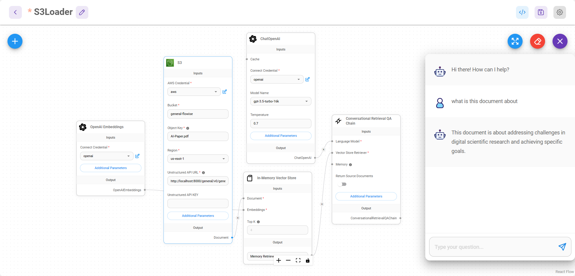 - You can then start chatting with your file from S3. You don’t have to specify the text splitter for chunking down the document because thats handled by Unstructured automatically.