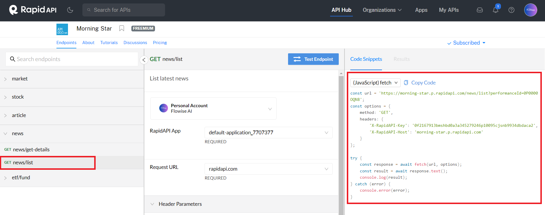 /news/listAPI to get the data. First you have to click Subscribe to Test if you haven’t already, then copy the code and paste it into JavaScript Function.- Add