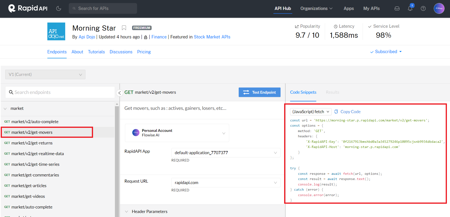 /market/v2/get-moversAPI to get data. First you have to click Subscribe to Test if you haven’t already, then copy the code and paste it into JavaScript Function.- Add