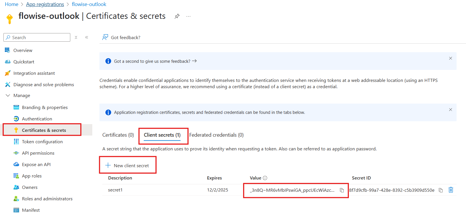 - After created application, navigate to Certificates & secrets > Client secrets and click on the “New client secret” button to create a client secret. Copy the secret to use later.