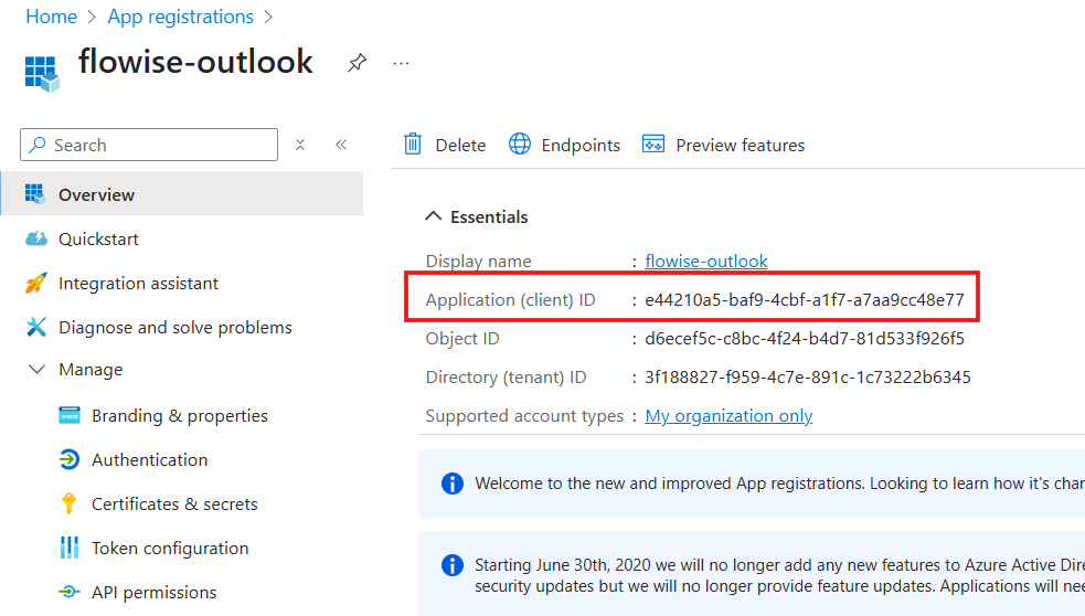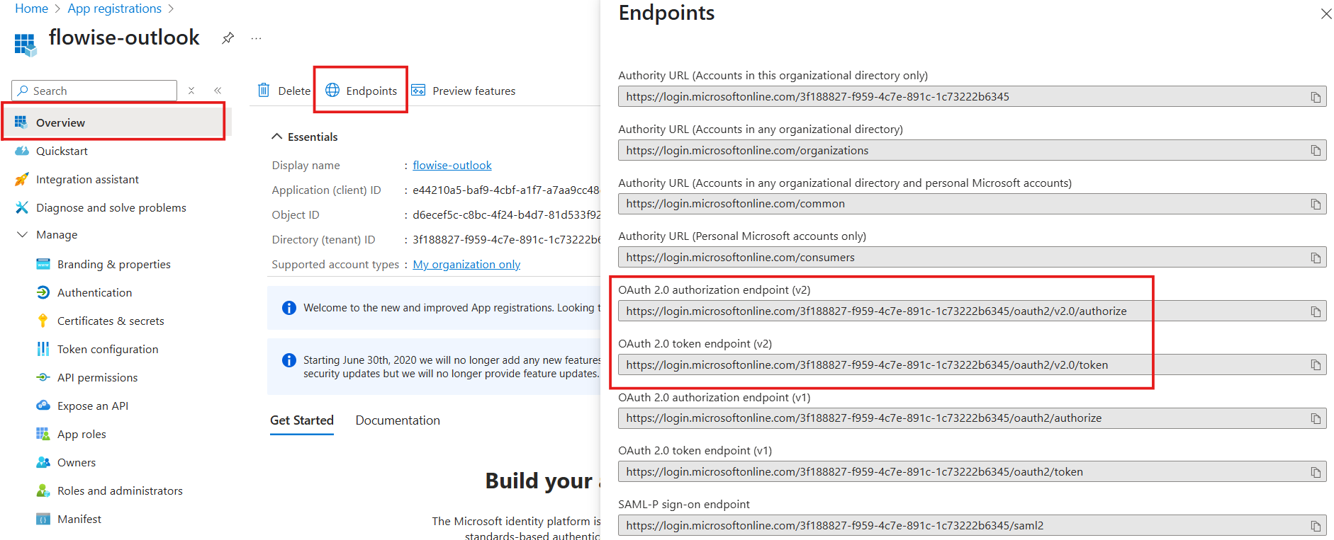- Navigate to Overview and click “Endpoints”. Copy the endpoints for “OAuth 2.0 authorization endpoint (v2)” and “OAuth 2.0 token endpoint (v2)”.