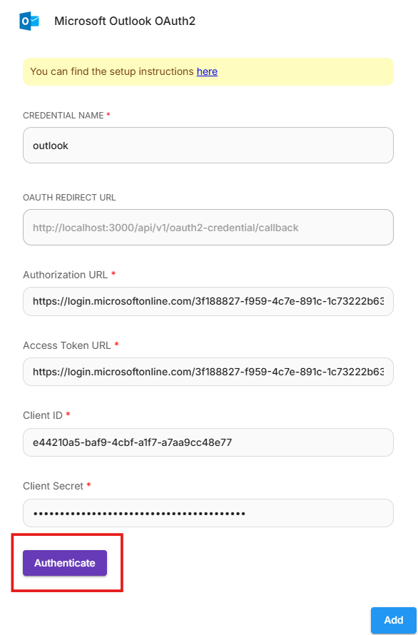 - Fill in all the values copied earlier. Then click “Authenticate”: