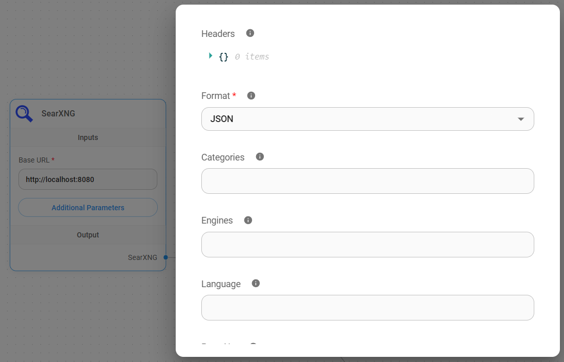 Drag and drop SearXNG node onto canvas. Fill in the Base URL as http://localhost:8080. You can also specify other search parameters if needed. LLM will automatically figure out what to use for the search query question.