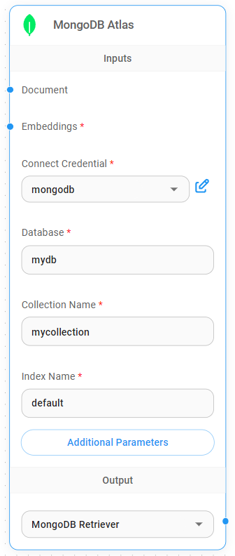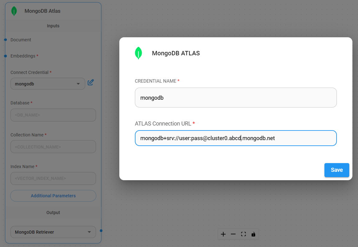 Drag and drop the MongoDB Atlas Vector Store, and add a new credential. Use the connection string provided from the MongoDB Atlas dashboard:
