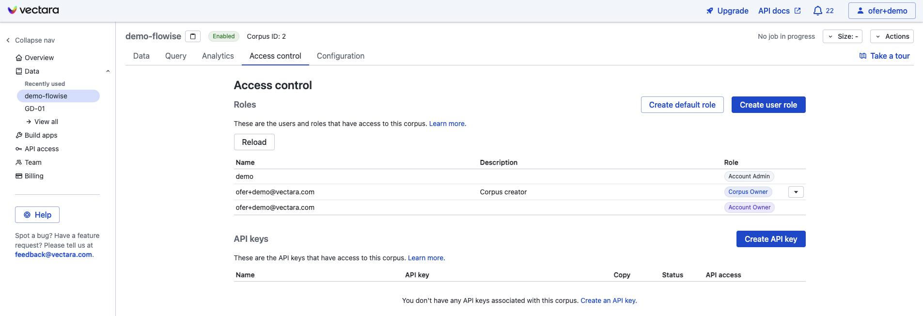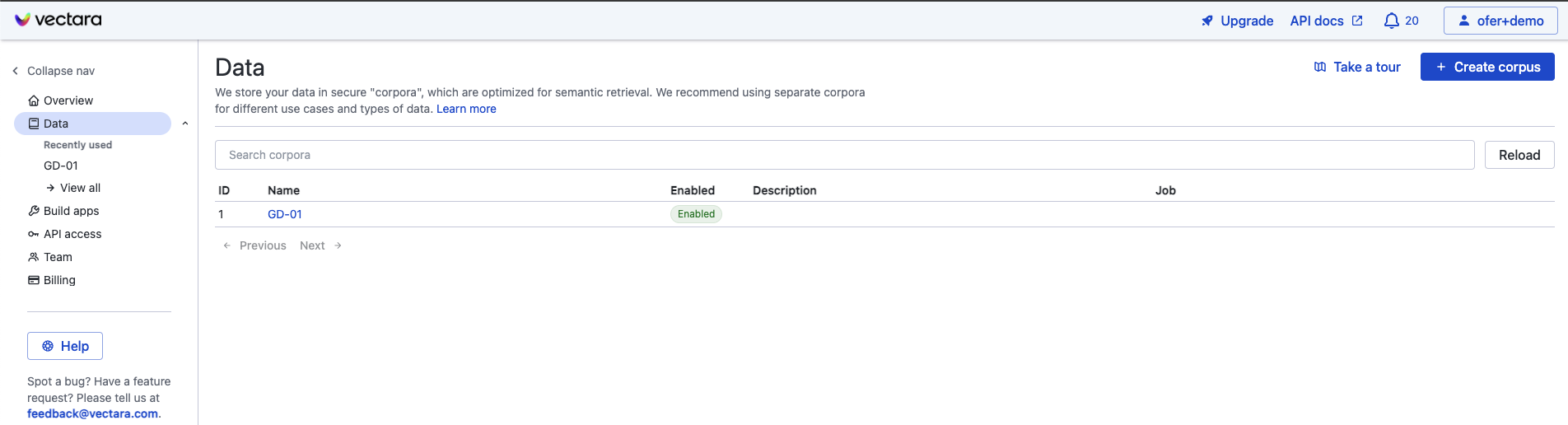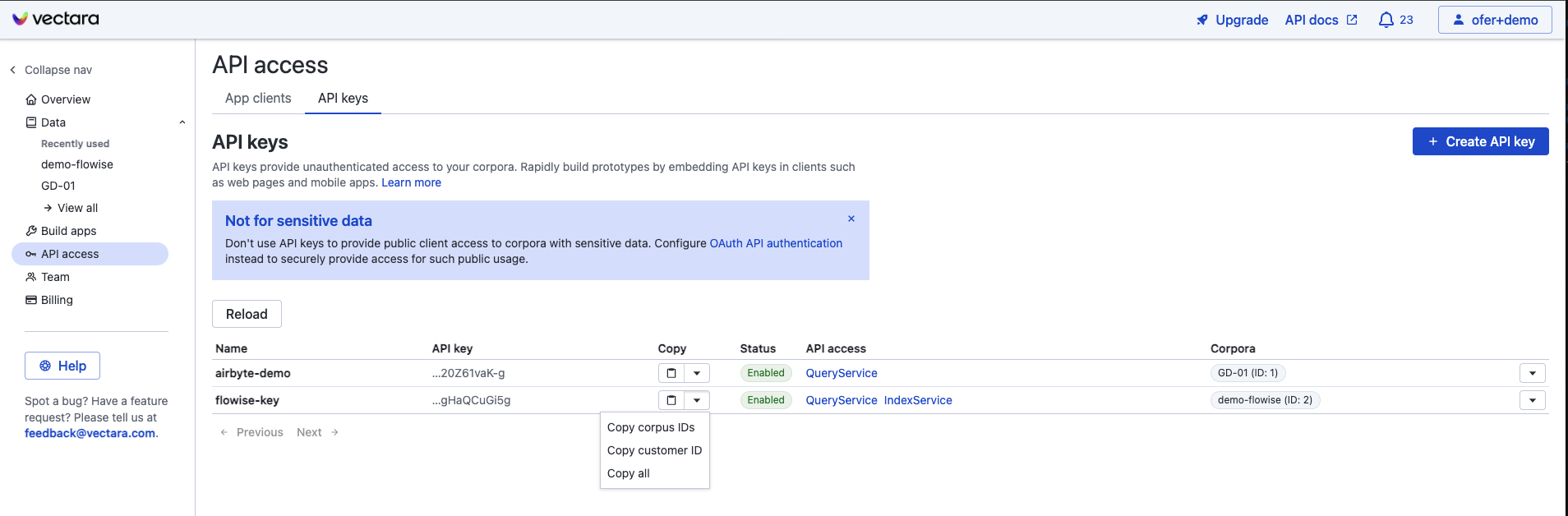 - Get your Corpus ID, API Key, and Customer ID by clicking the down-arrow under “copy” for your new API key: