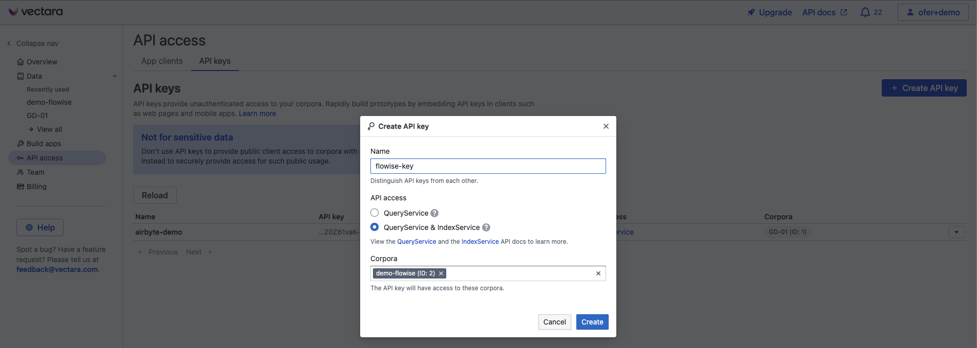 - Back to Flowise canvas, and create your chatflow. Click Create New from the Credentials dropdown ane enter your Vectara credentials.