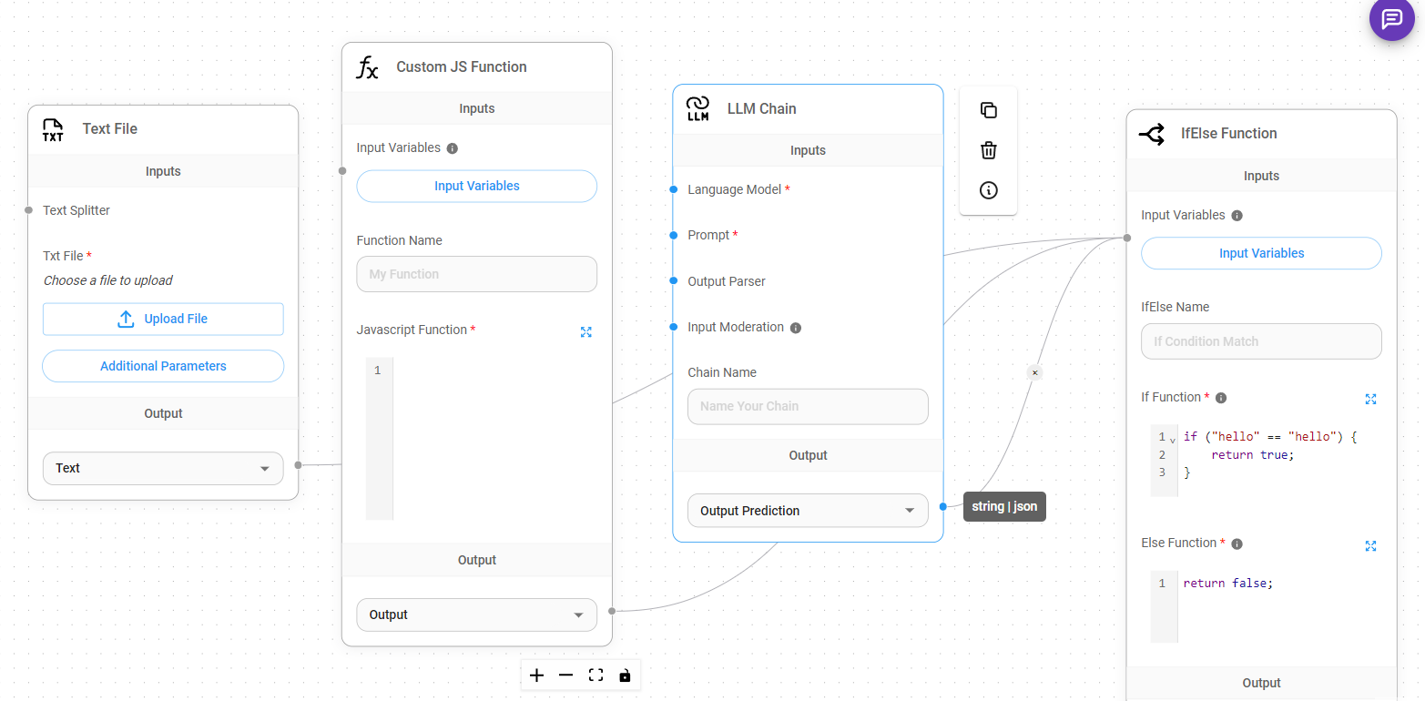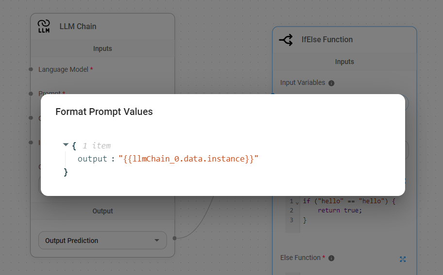 As noticed from the image above, it takes in any nodes that has json output. Some examples are: Custom Function, LLM Chain Output Prediction, Get/Set Variables.