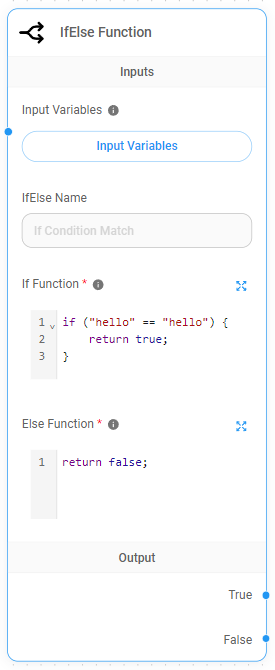 When the If Function successfully returns a value, it will be passed to the True output dot as shown above. This allow users to pass the value to the next node.