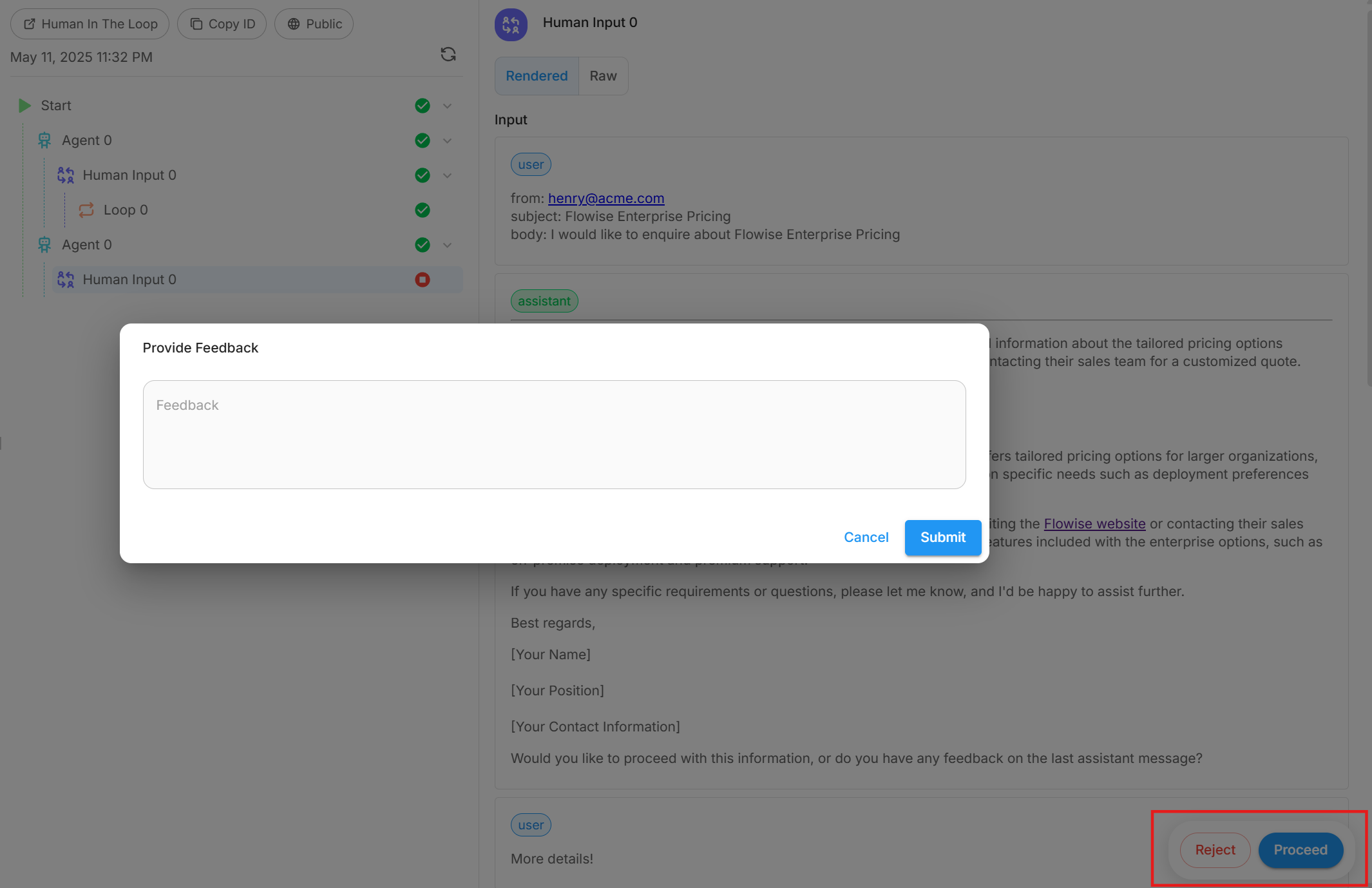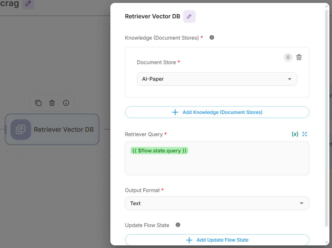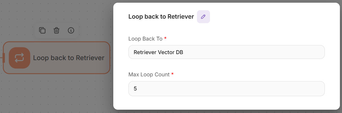 - Loop Back To: Select “retrieverAgentflow_0-Retriever Vector DB”