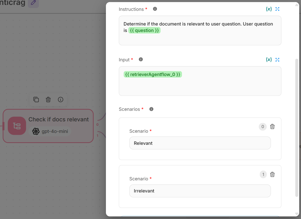 {{ retrieverAgentflow_0 }}(references the retrieved documents from Step 5) - Scenarios: