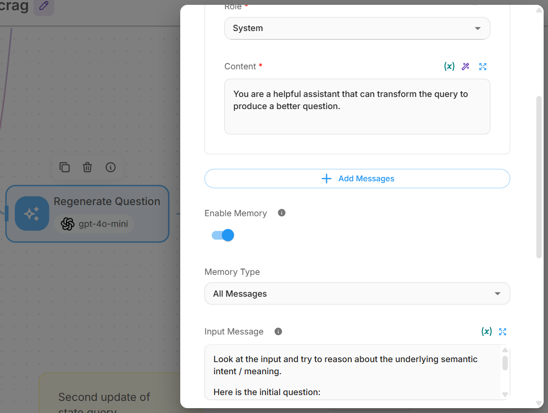Messages: Add system message: “You are a helpful assistant that can transform the query to produce a better question.”