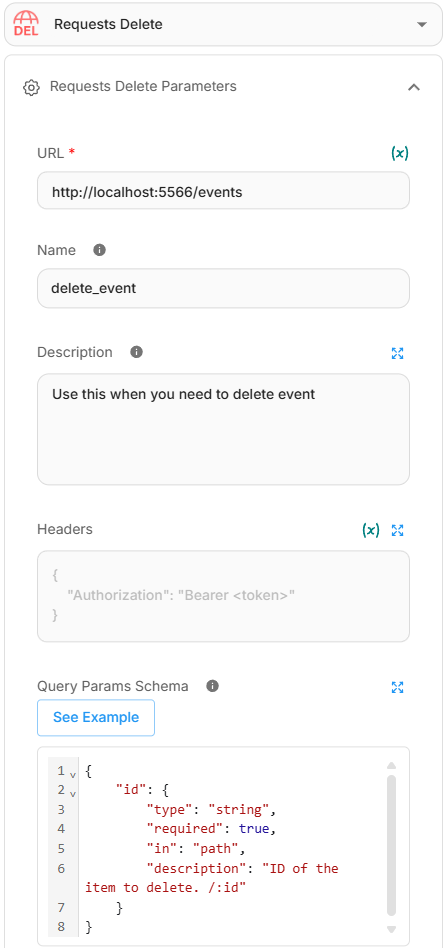 http://localhost:5566/events/12345. - The agent confirms the event was deleted.