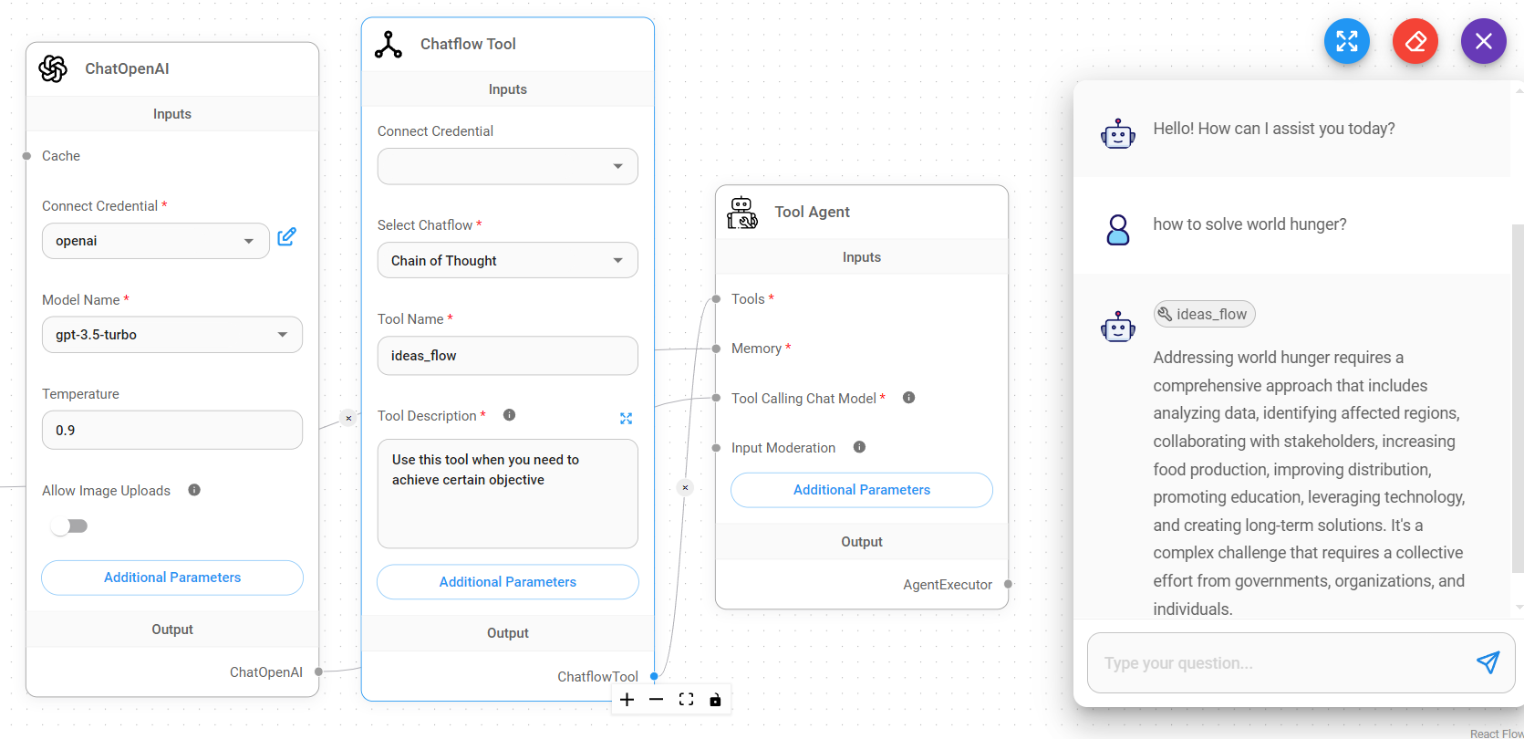 - Have a chatflow ready. In this case, we create a Chain of Thought chatflow that can go through multiple chainings.