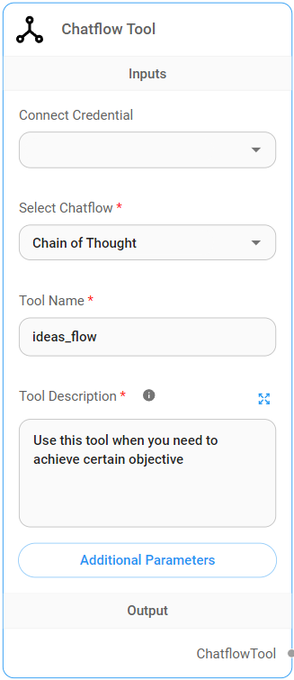 With the same example as above, we are going to create a custom tool that will calls the Prediction API of the Chain of Thought chatflow.
