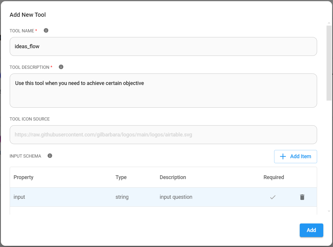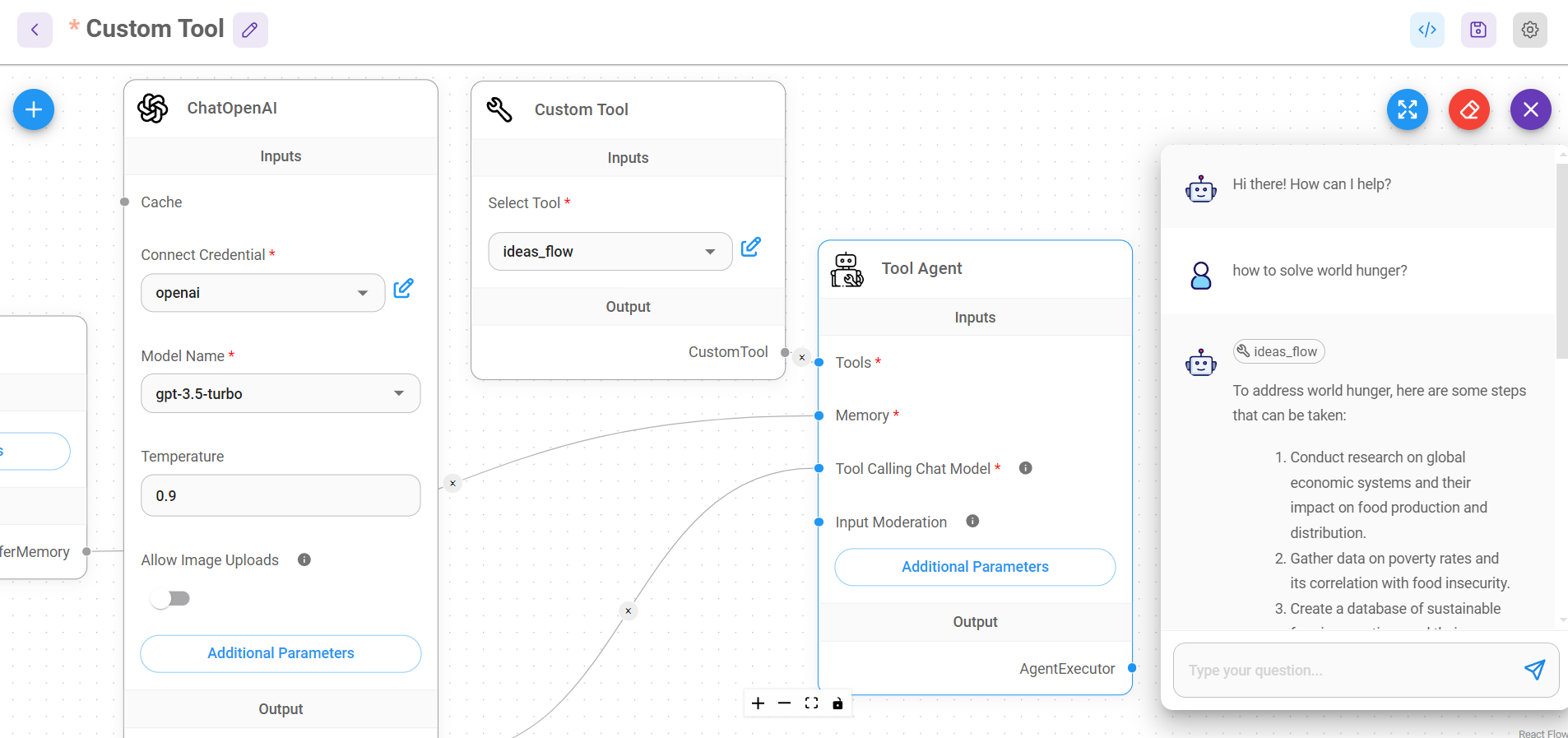 }- Create a Tool Agent + Custom Tool. Specify the tool we’ve created in Step 1 in the Custom Tool.