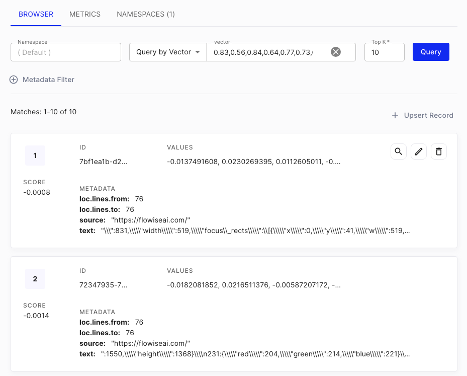 - On the Pinecone console you will be able to see the new vectors that were added.