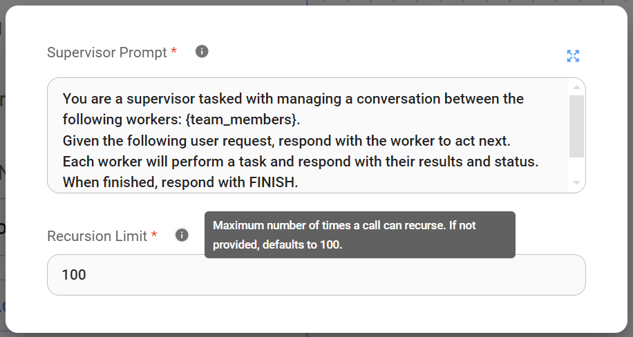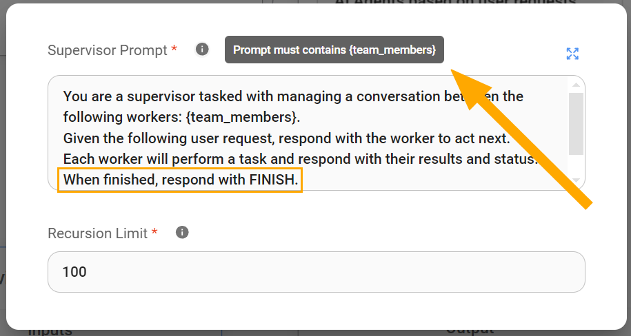{team_members}Variable: This variable is crucial for the Supervisor’s understanding of the available workforce since it provides the Supervisor with list of Worker names. This allows the Supervisor to diligently delegate tasks to the most appropriate Worker based on their expertise. - The “FINISH” Keyword: This keyword serves as a signal within the Supervisor Prompt. It indicates when the Supervisor should consider the task complete and present the final output to the user. Without a clear “FINISH” directive, the Supervisor might continue delegating tasks unnecessarily or fail to deliver a coherent and finalized result to the user. It signals that all necessary sub-tasks have been executed and the user’s request has been fulfilled.