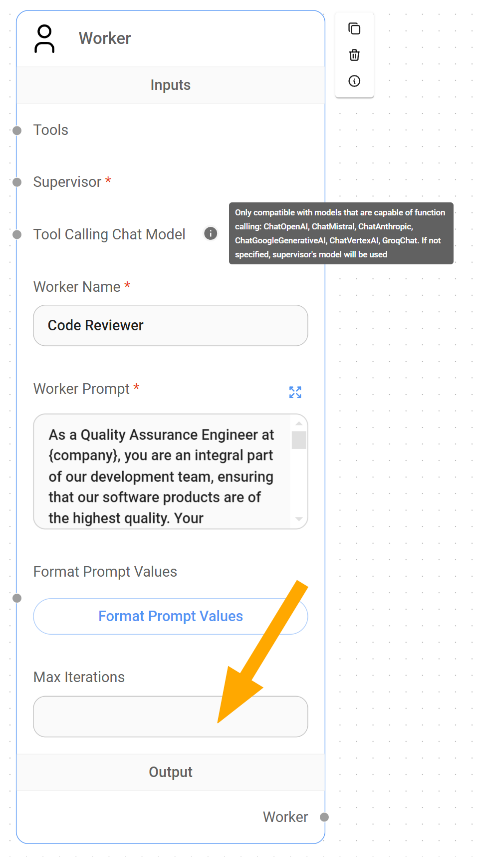 Unlike the Supervisor node’s Recursion Limit, which restricts how many times the Supervisor can call itself, the Worker node’s Max Iteration parameter limits how many times a Supervisor can iterated or query a specific Worker.