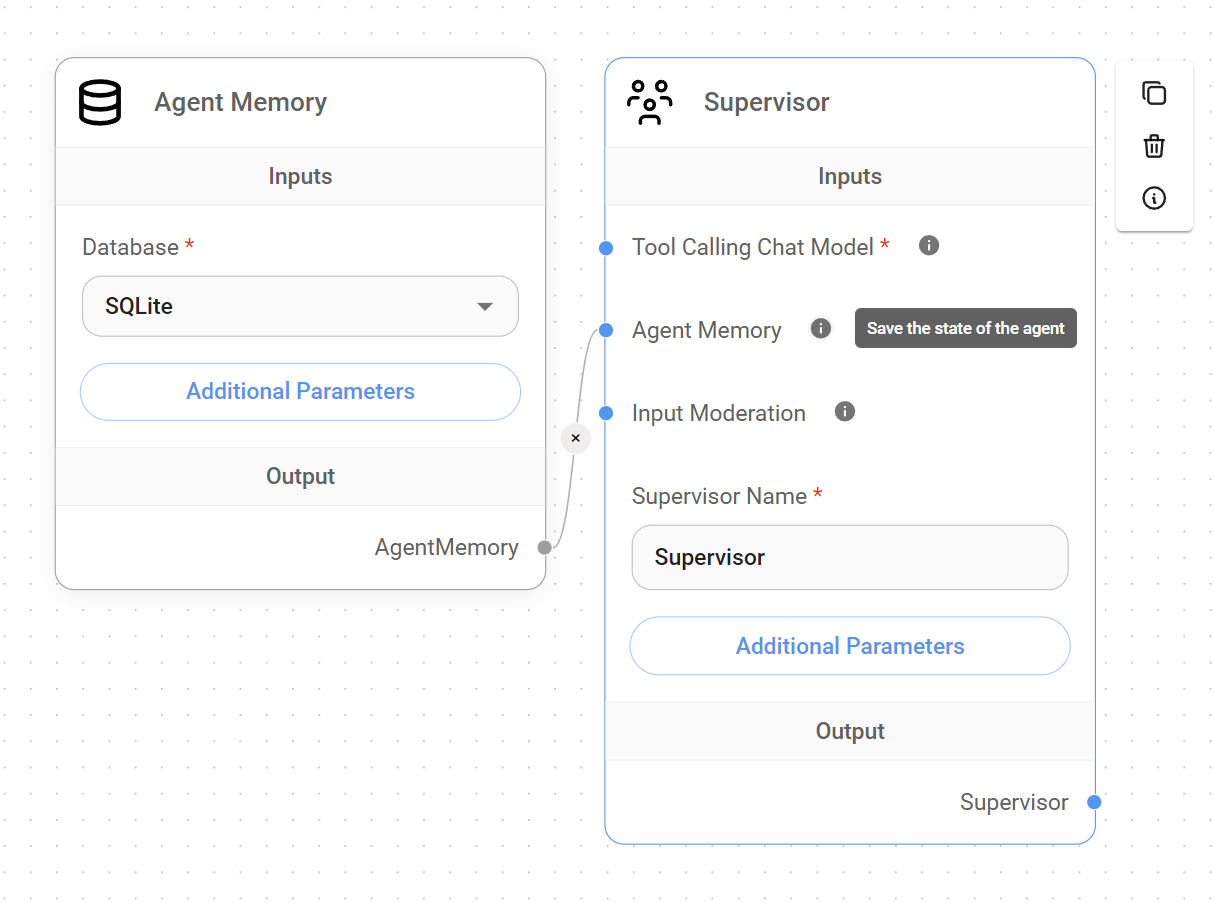- Agent Memory (optional): While the Supervisor can function without Agent Memory, this node can significantly enhance workflows that require access to past Supervisor states. This state preservation could allow the Supervisor to resume the job from a specific point or leverage past data for improved decision-making.