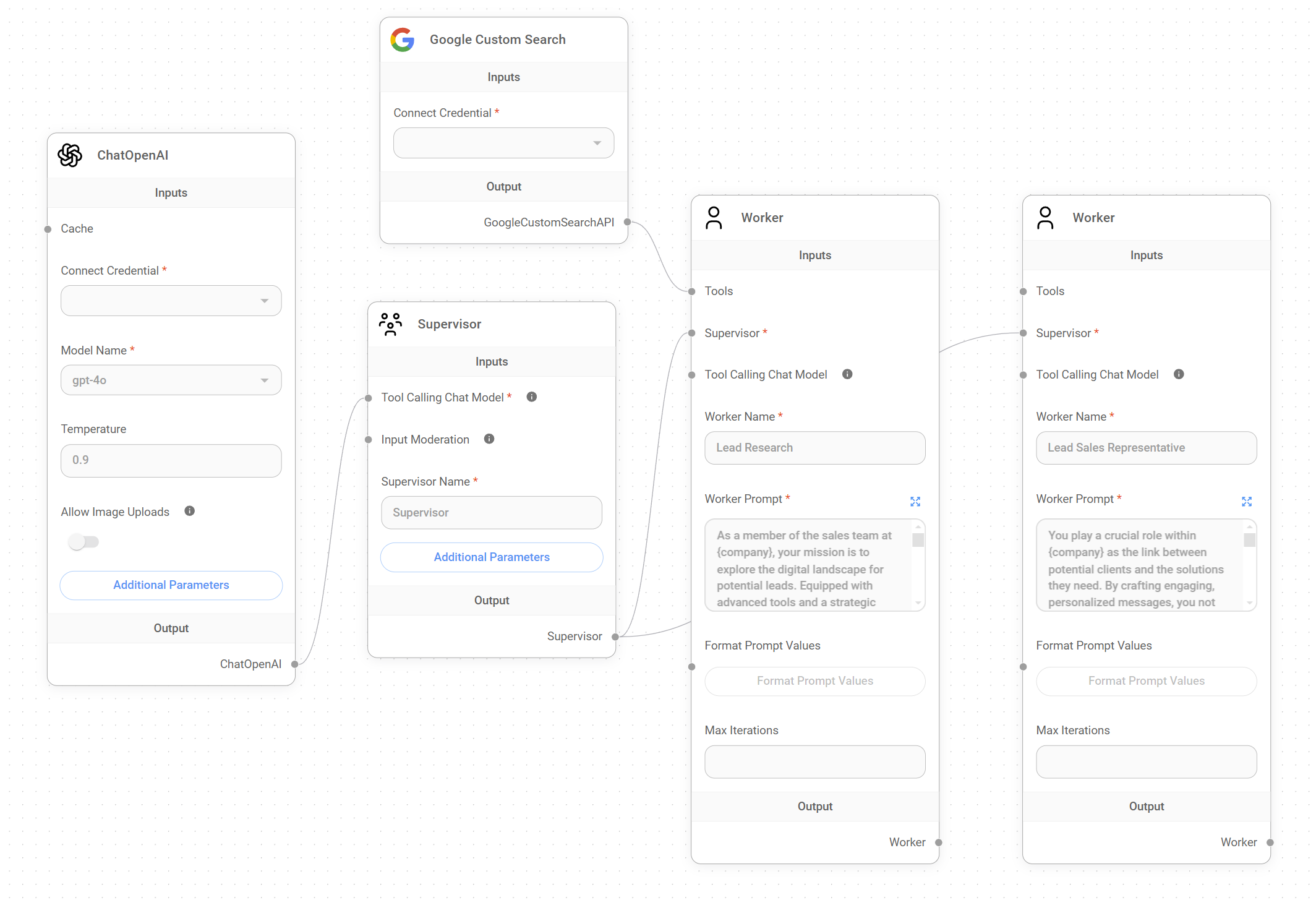 - A Supervisor: Each Worker must be connected to the Supervisor so it can be called upon when a task needs to be delegated. This connection establishes the essential hierarchical relationship within the multi-agent system, ensuring that the Supervisor can efficiently distribute work to the appropriate specialized Workers.