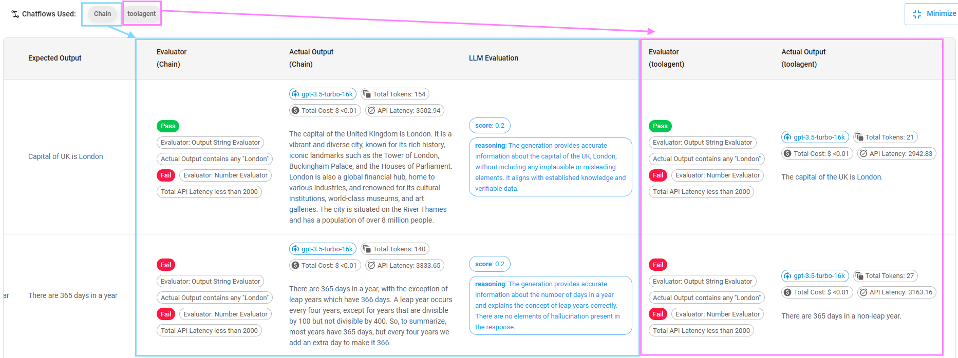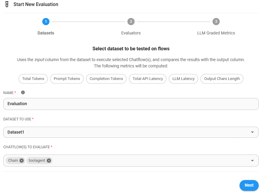 1.) Select dataset and chatflow to evaluate. You can select multiple datasets and chatflows. Using the example below, every inputs from Dataset1 will be ran against 2 chatflows. Since Dataset1 has 2 inputs, a total of 4 outputs will be produced and evaluated.