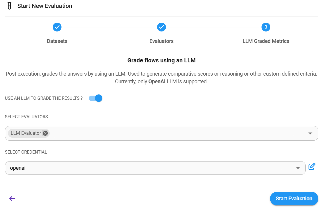 3.) (Optional) Select LLM Based evaluator. Start Evaluation: